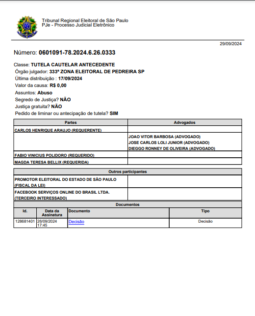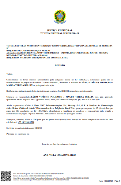 Por esta razão, a Juíza Eleitoral proferiu a seguinte decisão: "Considerando os fortes indícios apresentados pela coligação autora no ID 128679227, noticiando quem são os administradores da página do Facebook 'Aponta Pedreira', determino a inclusão de FÁBIO VINÍCIUS POLIDORO e MAGDA TERESA BELLIX no polo passivo da ação."